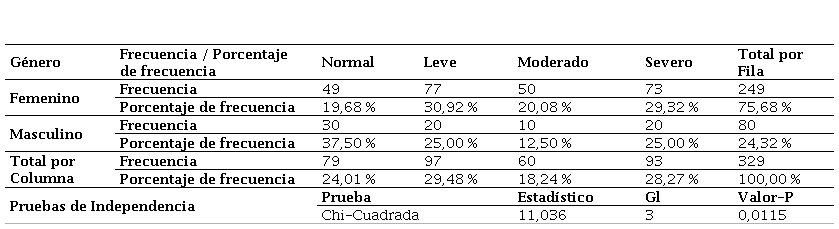 En cuanto al género masculino, se obtuvo que la categoría con mayor frecuencia o porcentaje fue la correspondiente a un nivel normal de estrés, con un 37,5 %; en cuanto al estrés severo, este fue del 25 %. Por su parte, las mujeres presentaron mayormente estrés leve, con un 30,92 %; no obstante, su nivel de estrés severo fue ligeramente superior al de los hombres, con un 29,32 %. Así las cosas, se observó una ligera tendencia a presentar mayores niveles de estrés moderado y severo en el género femenino que en el masculino. En este orden de ideas, en la Tabla 3 se puede apreciar que los individuos de género masculino tienen mayor inclinación a presentar niveles de estrés normales, en comparación con las de femenino, el cual tiene mayor propensión a presentar niveles más altos de estrés.