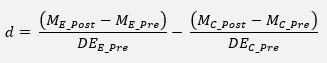 Para identificar el impacto de las guías desarrolladas en los resultados de aprendizaje de los estudiantes[1], se midió el tamaño del efecto . del recurso sobre las ganancias de aprendizaje (Cohen, 1992). Para medir el tamaño del efecto, se utilizó la siguiente ecuación: