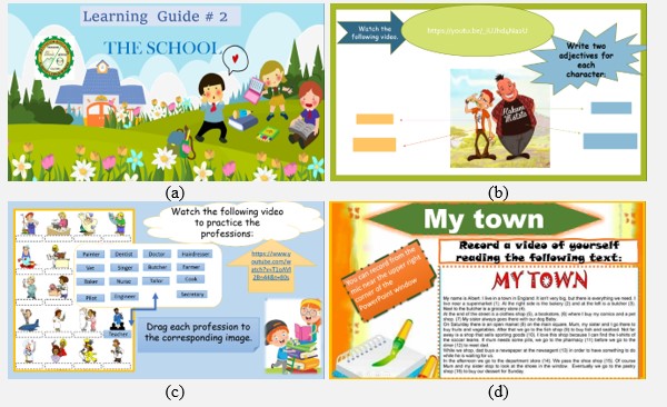 La estructura de las guías es la siguiente: la primera diapositiva presenta el nombre del proyecto. La segunda diapositiva presenta los objetivos. La tercera diapositiva presenta una pequeña introducción acerca de la temática a desarrollar. Las diapositivas cuatro a quince presentan el conocimiento teórico y una serie de actividades que deben ser desarrolladas por los estudiantes. Dichas actividades involucran el uso de herramientas de software como Microsoft Word y Paint, herramientas tecnológicas como cámara de video, cámara fotográfica, y micrófono (haciendo uso de un teléfono celular), y recursos online como YouTube. Finalmente, la diapositiva dieciséis concluye la actividad con un mensaje de despedida. La Figura 1 presenta cuatro imágenes con diversos aspectos de las guías. La Figura 1 (a) presenta la portada correspondiente a la guía # 2, la Figura 1 (b), corresponde a una actividad sobre adjetivos, la cual está incluida en la guía # 1. La Figura 1 (c), presenta una actividad sobre las profesiones en la guía # 3, y, finalmente, la Figura 1 (d), presenta una actividad relacionada con las partes de la ciudad, perteneciente a la guía # 4.