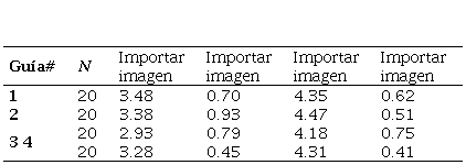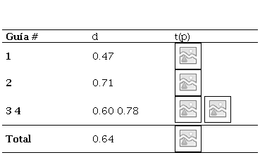 Los resultados en la Tabla 3 indican que, en conjunto, las guías desarrolladas tienen un impacto medio en las ganancias del aprendizaje de los estudiantes. El valor de la prueba indica resultados estadísticamente significativos en favor de los estudiantes en el grupo experimental. Aunque todas las guías presentan un impacto medio, las guías # 2 y # 4 presentan un impacto entre medio y grande en el aprendizaje de los estudiantes.