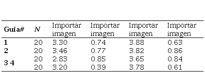 Procedimiento: El estudio de caso se llevó a cabo en un periodo de 30 días (seis reuniones), como se explica a continuación. En la primera reunión los estudiantes fueron convocados para hacerles partícipes del proceso y explicarles en qué consistía la implementación de las guías. Los estudiantes de cada grupo fueron convocados en horarios diferentes. Así pues, los estudiantes del grupo experimental no sabían de la existencia de un grupo control, ni los estudiantes del grupo control sabían de la existencia de un grupo experimental. En la segunda, tercera, cuarta, y quinta reunión se procedió con el estudio de las guías (cada guía en una reunión diferente). El procedimiento para la validación de cada guía fue el mismo: primero, se asignó a cada estudiante una prueba de conocimientos previo, la cual debían desarrollar en 15 minutos. Luego, se entregó la guía didáctica y se propuso para su realización un tiempo aproximado de 2 horas. Los estudiantes en el grupo experimental desarrollaron las guías mediadas por TIC, mientras que los estudiantes en el grupo control realizaron las guías propuestas por el MEN. Posteriormente, a cada uno ellos se les entregó el examen de conocimiento posterior, el cual debían completar en 15 minutos. Finalmente, en la sexta reunión los estudiantes realizaron la encuesta IMSS para medir su motivación para aprender mediante el desarrollo de las guías.