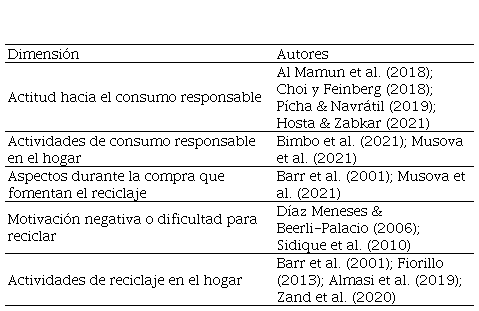 El estudio propuesto por Musova et al. (2021) evoca que existe relación entre las acciones de consumo responsable en el hogar, como la reducción en el consumo de recursos no renovables, con el reciclaje; aspecto que se asocia con los resultados obtenidos en este estudio. Asimismo, los estudios propuestos por Almasi et al. (2019) y Zand et al. (2020) indican que el conocimiento frente al consumo responsable hace que se apropien de forma más efectiva acciones de consumo responsable, como el reciclaje en el hogar, lo que coincide con los resultados obtenidos.