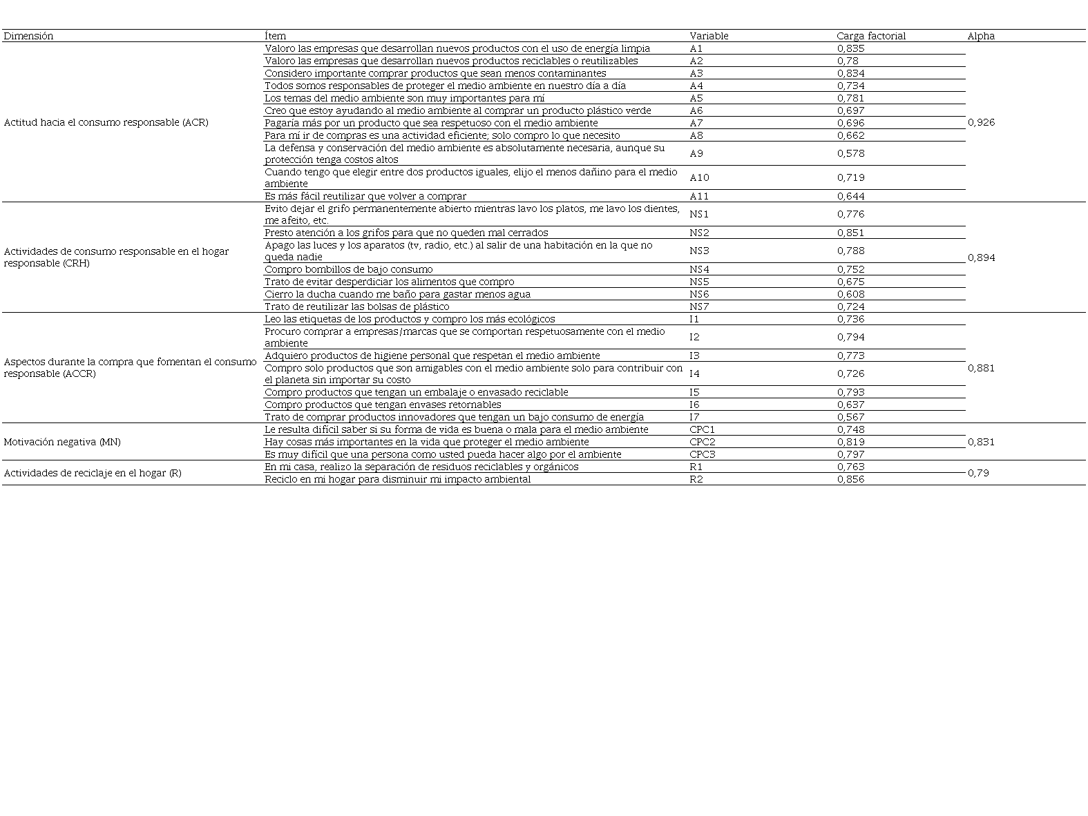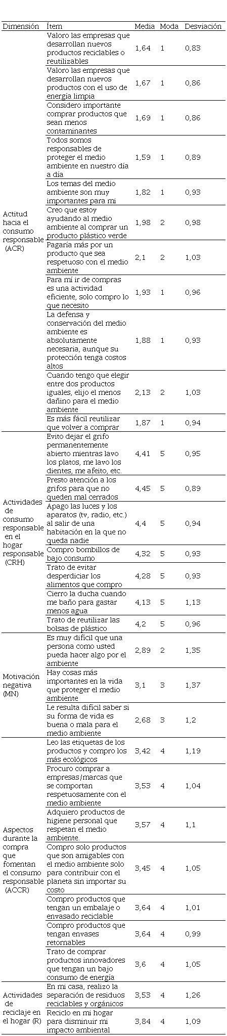 En la Tabla 4 se observan los resultados descriptivos para cada reactivo, en cada dimensión propuesta, donde se destaca que en la dimensión actitud hacia el consumo responsable, que hace referencia al juicio de valor, las respuestas son más orientadas a percepciones contrarias al contexto positivo hacia el consumo responsable, obteniendo valores para la media cercana a 1; aspecto que se replica con la moda, es decir, respuestas que involucran poco o nada de acercamiento frente a cada variable. Por su lado, las actividades de consumo responsable en el hogar evocan el comportamiento de mayor frecuencia, como el manejo del agua y la energía eléctrica; razón por la cual la moda obtiene el valor más alto de la escala Likert.
