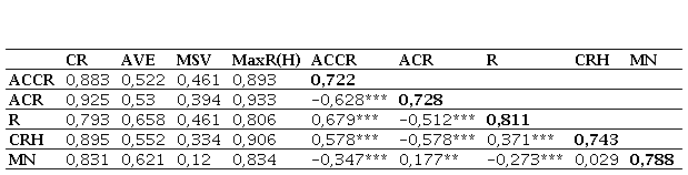 En la Tabla 3 se observan los resultados de la validez convergente y discriminante, tomando como referencia los parámetros definidos por Fornell y Larcker (1981). Se obtuvieron resultados satisfactorios con la varianza promedio extraída (AVE) y la fiabilidad compuesta (CR) para cada factor; así mismo, en cuanto al valor de Heterotrait-Monotrait Ratio of Correlations (HTMT) se obtuvieron valores inferiores a 0,9, cumpliendo así los parámetros de validez. Por otra parte, el modelo estructural se ajustó de forma adecuada, obteniendo un valor de Chi cuadrada significativa (x2= 1070,28, gl: 385, Sig. < 0.001), donde los índices de bondad de ajuste, como: Discrepancia entre x2 y grados de libertad (CMIN/DF =), Error de Aproximación Cuadrático Medio (RMSEA = 0,062), Índice de ajuste comparativo (CFI = 0,916), e Índice no normalizado de ajuste (TLI = 0,906) obtuvieron valores aceptables, de acuerdo con los criterios propuestos por Hu y Bentler (1999).