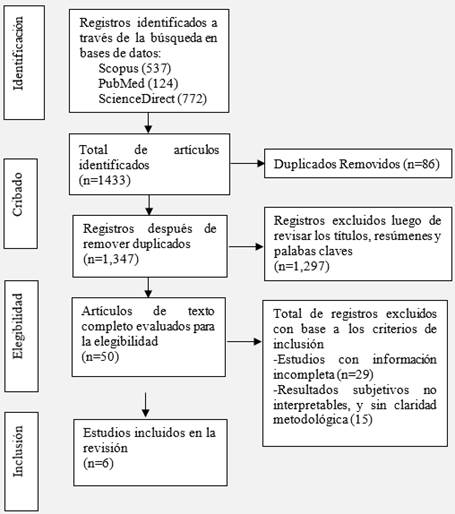 A continuación, se muestran los resultados de los estudios incluidos en la revisión sistemática. Al ingresar los descriptores de búsqueda, se identificaron 1433 estudios; en la base de datos Scopus: 537, PubMed: 124, y ScienceDirect: 772; se eliminaron 86 duplicados, y los excluidos luego de revisar título, resumen y palabras claves fueron 1297. Los artículos valorados para elegibilidad fueron 50, y de estos sólo 6 cumplieron criterios de calidad (Ver Figura 1).