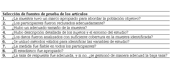Para la selección de los artículos se examinaron todos los títulos y resúmenes, con el fin de minimizar el sesgo; y para valorar la calidad, se obtuvo una puntuación si la respuesta era afirmativa para cada criterio empleado por SantaBárbara et al. (2021) descritos en la Tabla 2.