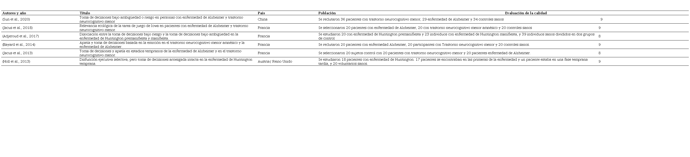 Los estudios de investigación seleccionados en la revisión sistemática que tuvieron una adecuada evaluación de la calidad corresponden a los países de Austria, China, Francia y Reino Unido, donde se reclutaron pacientes con trastorno neurocognitivo menor, enfermedad de Alzheimer, Huntington e individuos sanos (Ver Tabla 3).