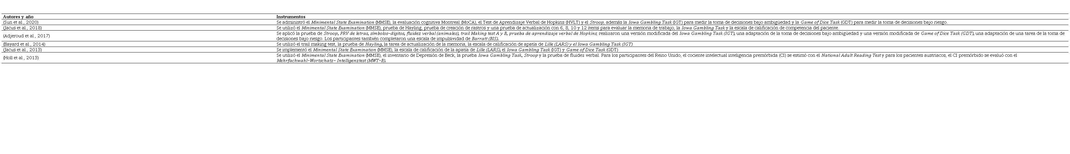 A continuación, se presentan los trabajos de investigación seleccionados con la discriminación de los instrumentos neuropsicológicos utilizados, donde es reiterativo el uso de la Iowa Gambling Task (IGT) para medir la toma de decisiones bajo ambigüedad y la Game of Dice Task (GDT) para medir la toma de decisiones bajo riesgo (Ver Tabla 4).