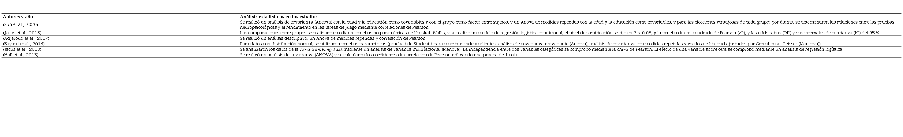 Los estudios seleccionados fueron de corte empírico analítico, que es un modelo que describe el método científico basado en experimentos. A continuación, está la discriminación de los análisis estadísticos utilizados en cada una de las investigaciones (Ver Tabla 5).
