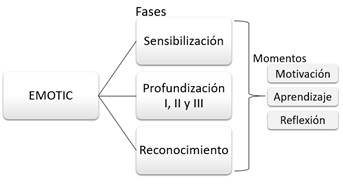 La estrategia didáctica llamada EMOTIC: Observando, sintiendo y reflexionando mis emociones voy formando, se implementó con cinco fases (ver Figura 2), y buscó que los estudiantes auto-reconocieran las emociones básicas: ira, miedo y tristeza (Del Barrio, 2005).