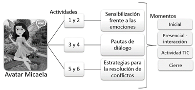La estrategia didáctica se basó en el planteamiento sobre Competencias Ciudadanas del Ministerio de Educación Nacional de Colombia (MEN, 2004). En total, se desarrollaron seis sesiones con cuatro momentos ejecutados en cada sesión (inicial, actividad presencial de interacción, actividad TIC y cierre). El desarrollo de la estrategia contó con un avatar, Micaela, el cual mantuvo un diálogo secuencial para darles pautas a los estudiantes (ver Figura 3).