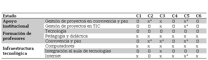 En los casos se identificaron tres aspectos que afectaron el desarrollo de las estrategias didácticas: el apoyo institucional, la formación del profesorado, y la infraestructura tecnológica. En la Tabla 1, “C” denota caso, “X” presencia del aspecto en la institución; y “” significa la no presencia del aspecto. Para identificar la presencia o no de estos aspectos se realizó una observación inicial al contexto, pero una vez aplicadas las estrategias expuestas, tres de las instituciones emprendieron cambios; esto se denota con un * al lado de la “X”.