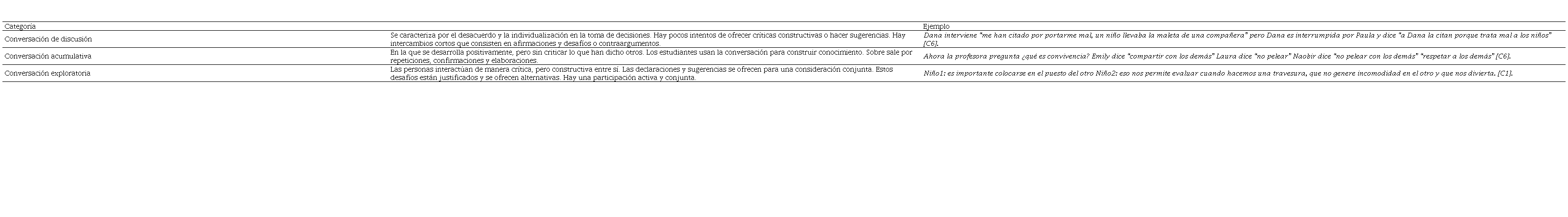 Al avanzar en las fases de las estrategias didácticas, las conversaciones acumulativas y exploratorias fueron surgiendo, con mayor participación y visiones diferentes de lo aprendido; ciertos estudiantes plantearon aportes hacia lo que otros proponían, discutían las ideas y no aceptaban lo planteado.