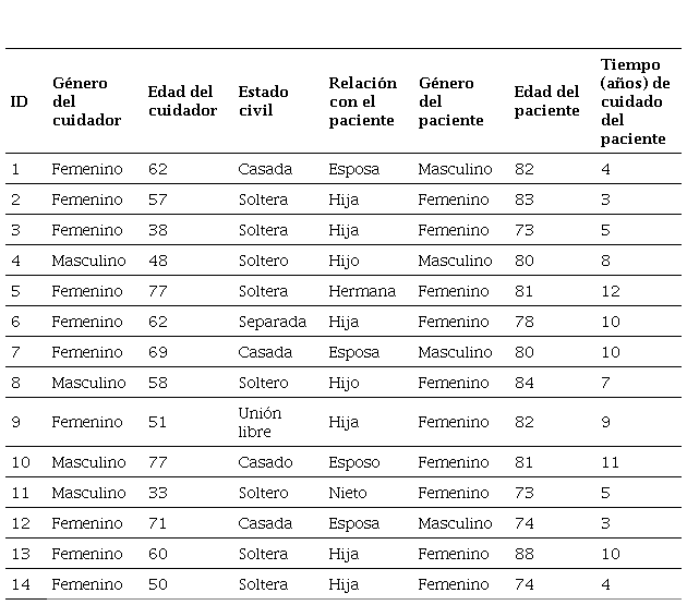 Los participantes del estudio fueron 14 personas cuidadoras familiares de pacientes con enfermedad de Alzheimer que hicieron parte del proyecto en mención. Los criterios de inclusión del estudio fueron, haber participado previamente en el macroproyecto, estar dispuesto a participar en la investigación y expresar las experiencias respecto al cuidado de un paciente con enfermedad de Alzheimer.