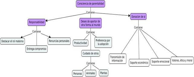 Los diálogos se fueron dando con las parejas alrededor de su postura frente a la parentalidad; en la Figura 2 se muestra que el tránsito y la toma de decisiones estuvo acompañado de una reflexión profunda sobre la paternidad y maternidad, la cual se denominó consciencia de parentalidad. Optar por no tener hijos surge de una postura racional que abre paso a interrogantes sobre la parentalidad puesta en el acto biológico, para cultivar formas de entender la maternidad y la paternidad desde el cuidado de la vida, incluida la de otras especies. Ante esto, no hay una renuncia total, por lo cual se abre paso a otras formas de concepciones parentales, entendidas desde la donación de sí. Bajo esta categoría se encuentran tres subcategorías: responsabilidad, deseo de aportar de otra forma al mundo, y donación de sí.
