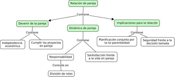 Como se señala en la Figura 3, esta categoría se compone de tres subcategorías: devenir de la pareja, dinámica de pareja e implicaciones para la relación. Estas son mutuamente influyentes, debido a que constituyen cómo se percibe la pareja en relación con ellos mismos, a su relación y a su toma de decisiones por la no parentalidad.