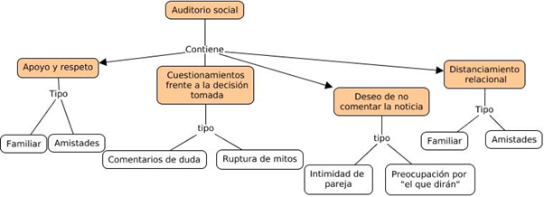 La vida en pareja enmarca, al mismo tiempo, diversos lazos relacionales que se extienden más allá de la relación. Frente a la decisión de no ser padres, también puede ser captada la voz del auditorio social habitado por los participantes. A continuación, se presentan las opiniones, actitudes y acciones que han tenido amigos, familiares, compañeros de trabajo, después de que las parejas han hecho pública dicha decisión. En la Figura 4 se presentan estas opiniones, las cuales dan lugar a tensiones, en las que se pueden evidenciar desde el respeto y el apoyo familiar, hasta cuestionamientos, dudas planteadas o de descontento frente a la decisión tomada.