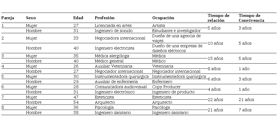 Como se muestra en la Tabla 1 en total participaron ocho parejas heterosexuales hispanoparlantes. Se realizó convocatoria abierta y un muestreo no probabilístico por bola de nieve con un criterio inicial: las parejas debían explicitar un deseo frente a la no parentalidad, cuyo origen no fuese biológico; en esta dirección, no debían tener hijos en la relación actual ni en otra relación previa. De esta manera, los primeros participantes referenciaron otras parejas que tenían potencial de cumplir los criterios de inclusión. De otro lado, solo se tuvieron en cuenta parejas que convivieran juntas por lo menos durante un año, con el fin de indagar por las dinámicas relacionales derivadas de la toma de decisión frente a la no parentalidad. A su vez, ambos miembros de la pareja debían estar de acuerdo con su participación dentro de la investigación. Se identificaron parejas que se encontraban en tránsito frente a la posibilidad o no de tener hijos; dichas parejas fueron excluidas de la investigación para privilegiar aquellas que expresaran una posición clara alrededor de la no parentalidad.