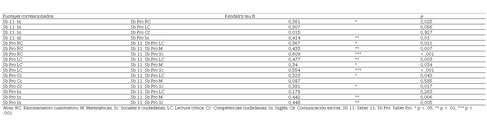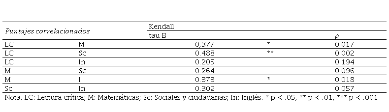 La Tabla 9 muestra con asteriscos dónde existe correlación fuerte, media y débil entre los puntajes de las competencias evaluadas. Los puntajes obtenidos en Saber Pro en las competencias Razonamiento cuantitativo y Lectura crítica están fuertemente correlacionados con los puntajes obtenidos en Saber 11, en la competencia Sociales y ciudadanas. Las correlaciones identificadas podrían plantear la posibilidad de trabajar de manera interdisciplinar.