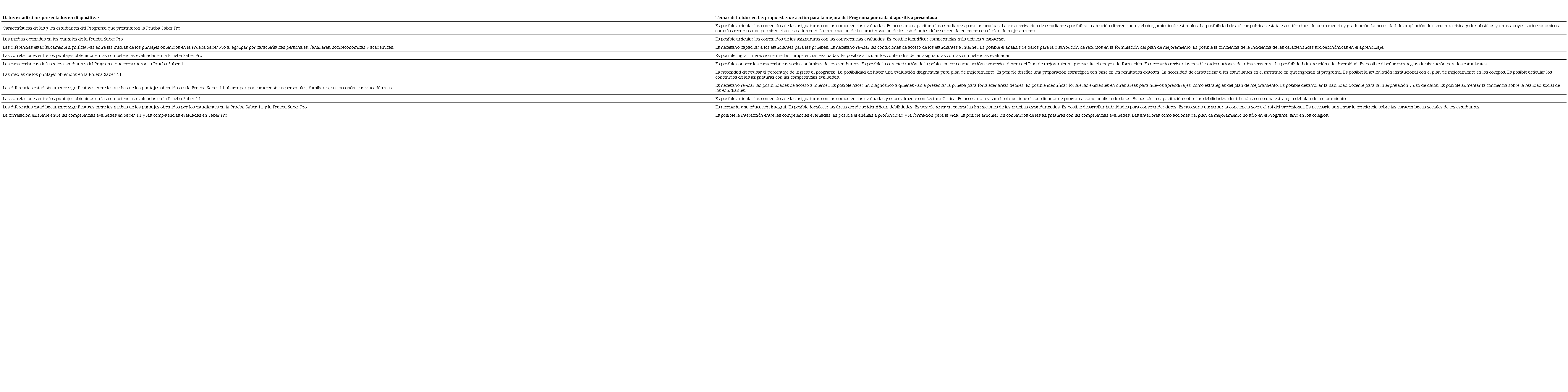 La necesidad de articular los Programas académicos y sus temáticas con los elementos de las competencias evaluadas. Surgió como propuesta al exponer las características personales, familiares, socioeconómicas y académicas de los estudiantes, las diferencias estadísticamente significativas entre las medias de los puntajes obtenidos en la Prueba Saber 11 y en la Prueba Saber Pro, y la correlación existente entre las competencias evaluadas en ambas pruebas. Esta información, también, permitió a los profesores pensar en la importancia de tener en cuenta las acciones del plan de mejoramiento no solo en el Programa, sino en los colegios, especialmente en lectura crítica. Al respecto, es importante tener en cuenta que los esfuerzos que se hagan desde la política nacional para fortalecer la lectura en lengua materna mejorarían los resultados en otras competencias (Gutiérrez Duque & Mayora Pernía, 2021) y que los marcos reductivos de la MDE, que analizan componentes individuales y sus relaciones, facilitan la mejora de las técnicas de evaluación y la disminución de la tasa de abandono (Patil & Gupta, 2019).