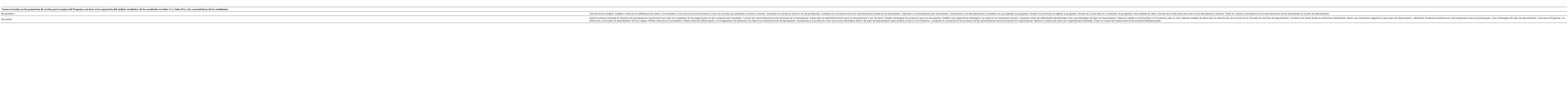 ¿Cuáles son las acciones y estrategias que pueden incluirse en el plan de mejoramiento del programa, luego de conocer el resultado de las relaciones y diferencias encontradas entre las características de los estudiantes y los resultados en Saber Pro y Saber 11 y, las encontradas entre las dos pruebas?