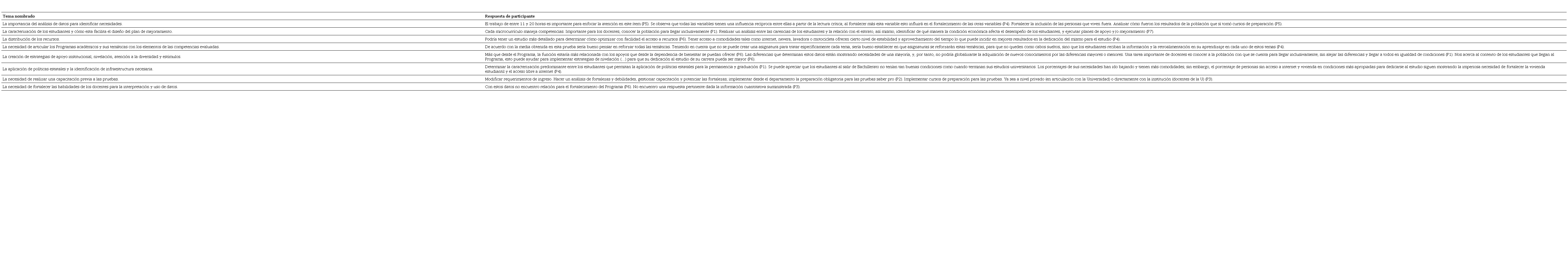 Los temas identificados fueron revisados como se muestra en la Tabla 11. En esta revisión se eliminaron las propuestas duplicadas, se unieron las propuestas similares y se agruparon los temas enunciados por los profesores como necesidades o posibilidades para la mejora del programa.
