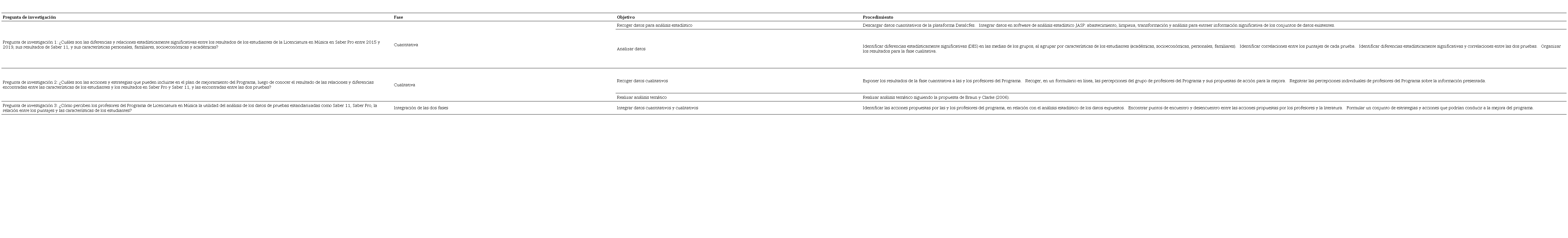 Se usó una investigación mixta, con diseño secuencial y exploratorio, como lo definen Creswell & Plano Clarck (2017), para recoger, analizar y mezclar métodos cuantitativos y cualitativos con el propósito de lograr una mayor comprensión del problema y las preguntas de investigación. Esta investigación inició con una fase cuantitativa que se basa en el análisis, estadístico descriptivo, de diferencias y de relaciones realizado a través del software de análisis estadístico JASP V. 0.14.1.0. Se tomó el resultado del análisis de la fase cuantitativa para preparar la fase cualitativa; se recogió información en la fase cualitativa, a través de un formulario en línea que se diligenció durante reunión con profesores de la Licenciatura en Música, a quienes se expuso, usando diapositivas, el análisis estadístico. Con la información escrita en el formulario en línea, se realizó un análisis temático usando la ruta propuesta por Braun y Clarke (2006): (1) transcribir los datos; (2) codificar y recoger información relevante; (3) definición de temas; (4) revisión de temas; (5) nombrar temas; y (6) producir el informe. Por último, se efectuó la integración de las dos fases y sus resultados para construir el apartado de discusión (ver Tabla 1).