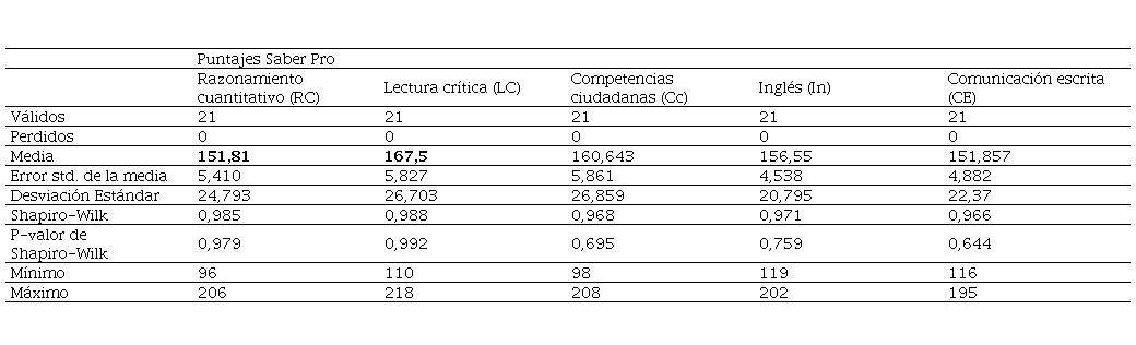 Los datos analizados pertenecen a 21 estudiantes de Licenciatura en Música de una universidad pública en la zona suroccidental del país, que nacieron entre 1989 y 1997, y presentaron la Prueba Saber Pro entre 2015 y 2019. De estos estudiantes, 85,7 % son de género masculino; 33,3 % de los padres y 33,3 % de las madres de los estudiantes tienen Bachillerato completo. El 23,8 % de los padres de los estudiantes es pensionado, mientras que el 23,8% de las madres permanece en el hogar. El 95,2% de los estudiantes reside en el Cauca, de ellos el 76,2% reside en Popayán. El 38,1 % en estrato 1, el 23,8 % no posee computador, el 52,4 % no cuenta con lavadora en su hogar, el 66,7 % no posee horno, y el 95,2 % no tiene automóvil. El 23,8 % trabajó menos de 20 horas semanales. En cuanto a la matrícula, el 90,5 % pagó menos de $ 500.000, al 68,4 % sus padres le pagaron y el 58,8 % pagó su propia matrícula. El 45 % cursaba noveno semestre cuando presentó la Prueba. Estos porcentajes permiten conocer algunas de las características personales, familiares, socioeconómicas y académicas de la población analizada. Más adelante se muestra si estas características tienen relación o no con los resultados obtenidos. En cuanto a los puntajes obtenidos, la Tabla 2 muestra que Lectura crítica y Razonamiento cuantitativo tienen las más alta y baja media, respectivamente.
