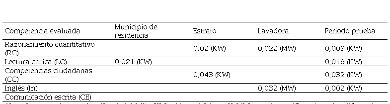 La Tabla 3 muestra las diferencias estadísticamente significativas (DES) encontradas cuando se agrupó a los estudiantes por características. Solo las siguientes características evidenciaron DES en las medias de los puntajes obtenidos en las competencias que están entre paréntesis: municipio de residencia (Lectura Crítica); estrato (Razonamiento cuantitativo, Competencias ciudadanas); lavadora (Razonamiento cuantitativo, Inglés); período prueba (Razonamiento cuantitativo, Lectura Crítica, Competencias ciudadanas, Inglés). Llama la atención que el periodo de presentación de la prueba muestra DES en los puntajes obtenidos por los estudiantes en cuatro de las cinco competencias evaluadas. También, llama la atención que el municipio de residencia, el estrato y el tener o no lavadora señalan DES.