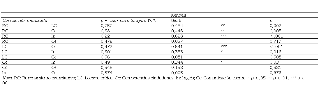 La Tabla 4 muestra la correlación entre los puntajes obtenidos en las competencias evaluadas en Saber Pro. RC: Razonamiento cuantitativo; LC: Lectura crítica; Cc: Competencias ciudadanas; I: Inglés; Ce: Comunicación escrita. Existen correlaciones muy fuertes (RC-I; LC- Cc), fuertes (RC-LC; RC- Cc) y débiles, aunque significativas (LC-I; Cc-I). Estas correlaciones son un insumo para investigaciones futuras, que podrían indagar sobre las causas.