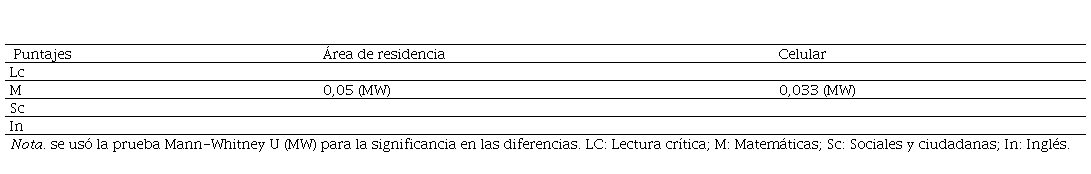 La Tabla 6 muestra que existe una diferencia estadísticamente significativa en los puntajes obtenidos en Matemáticas, al agrupar a los estudiantes por área de residencia o por servicio de celular. A pesar de desconocer la razón de estas diferencias en las medias de los puntajes, esta información se convierte en insumo para investigaciones posteriores que permitan explorar las razones por las cuales el área de residencia, y contar o no con servicio de celular, marcan diferencias significativas en los puntajes de Matemáticas. En relación con los datos de Saber Pro, mientras el municipio de residencia marcó una DES en Lectura crítica, en Saber 11 es el área de residencia la que marca una DES en Matemáticas. Mientras que en Saber Pro el servicio de lavadora marcó DES, en Saber 11 es el servicio de celular.