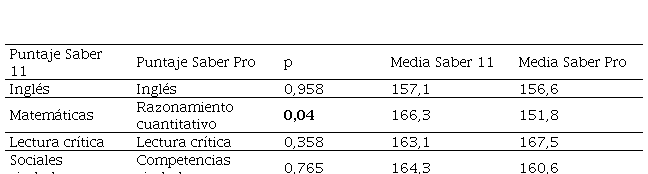En comparación con lo encontrado en Saber Pro, mientras la media en Matemáticas (Saber 11) obtuvo el mayor valor entre las competencias evaluadas, la media de Razonamiento cuantitativo (Saber Pro) fue la más baja.