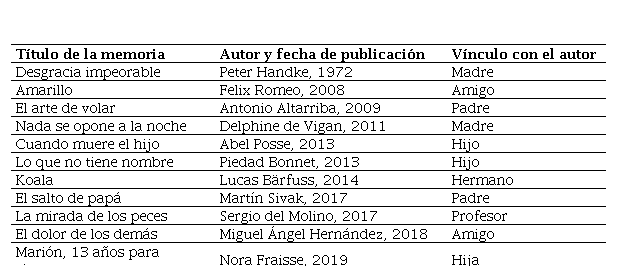 Para la selección de las obras, se utilizaron estrategias de investigación documental que permitieron rastrear memorias escritas hasta 2020 y que tratan sobre la experiencia de perder a un ser amado por suicidio. Se encontraron once obras (Tabla 1) con las que se hizo un trabajo descriptivo que permitió definir los criterios para el siguiente paso: la elección de una de ellas para la interpretación a profundidad. Para la selección se consideró que el contenido de la obra privilegiara el relato en torno al acto suicida y sus efectos en la experiencia del duelo narrado. En cuanto al estilo, se buscó que la memoria tuviera una escritura intimista, con riqueza simbólica y un uso elaborado de figuras literarias. Finalmente, se consideró que el propósito comunicativo del relato privilegiara la reflexión sobre la experiencia de un duelo complejo; se descartaron los relatos cuya intención es servir como una especie de manual de autoayuda para el lector o que se presentan ante este como un ejemplo a seguir de la recuperación exitosa de quien escribe.
