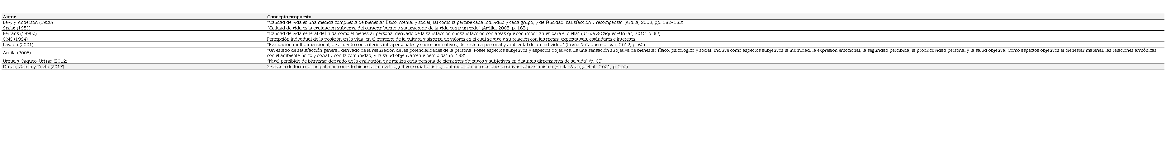 No existe consenso sobre el concepto de calidad de vida. Dependiendo del área desde donde se estudie (psicología, medicina, economía, otras ciencias sociales) el acento se pone en sus determinantes y su forma de medición. En la Tabla 2 se muestran, de manera cronológica, algunos conceptos que evidencian lo amplio del mismo y se puede apreciar que está relacionado con un conjunto de cualidades que se poseen o que faltan en la vida de un individuo o de un grupo configurado a través de la cultura. La calidad de vida en estos conceptos implica una percepción individual donde cobra importancia la opinión de los sujetos y se evidencia que la calidad de vida está asociada con diferentes dimensiones que la persona puede valorar, lo cual representa una gran dificultad, porque “no existen parámetros universales sobre lo que puede ser una buena u óptima calidad de vida, ya que los estándares con los que se evalúa son distintos dependiendo de los individuos y de la sociedad” (Urzúa & Caqueo-Urízar, 2012, p. 63).