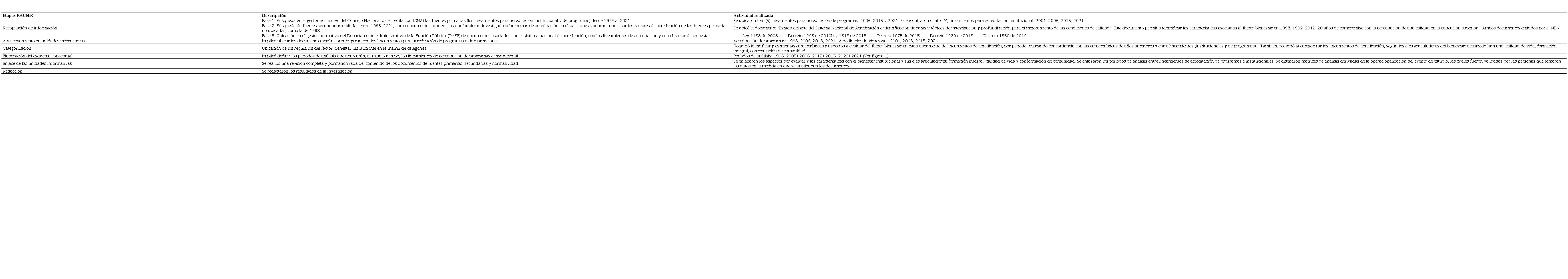 El diseño fue documental, evolutivo transversal, contemporáneo, porque se basó en los documentos que establecen los lineamientos para acreditación institucional y de programas. Se utilizó, como técnica de investigación, la revisión documental RACEER (Hurtado de Barrera, 2010), cuyas letras indican el proceso que se siguió: Recopilación de la información, Almacenamiento en unidades informativas, Categorización, Elaboración del esquema conceptual, Enlace de las unidades informativas y Redacción, tal como se describe en la Tabla 4.