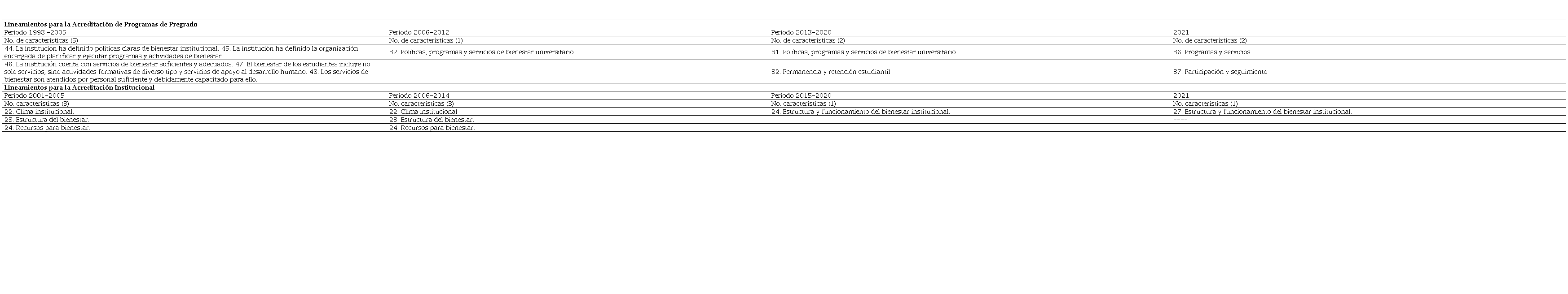 Como se puede apreciar en la Tabla 5 los periodos de tiempo entre la acreditación de programas e institucional se traslapan, por lo cual estos se reorganizaron para abarcar de manera simultánea los lineamientos de acreditación de programas e institucional y facilitar su análisis. La Figura 1 presenta este resultado. El análisis de las características y los aspectos a evaluar en el factor bienestar institucional, a lo largo de estos años, tanto en los lineamientos de acreditación institucional como en los de programas, evidencia los aspectos que se describen a continuación: