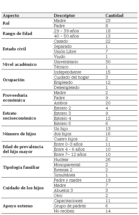 El proceso incluyó una búsqueda de los participantes en la comunidad de Universo de Familias, espacio virtual dedicado a la reflexividad de las maternidades, paternidades y crianza. Igualmente, se pudo ampliar la búsqueda de padres y madres a través del método bola de nieve, el cual permitió explorar otros grupos poblacionales sugeridos por profesionales psicosociales de terapia y desarrollo familiar. No hubo atributos académicos, de estratificación social, edad, sexo o género, etnia o cultura para la participación en el estudio; no obstante, se hizo un proceso de caracterización sociodemográfica de los participantes que ayudó a situar y contextualizar las experiencias e información suministrada (ver Tabla 1).