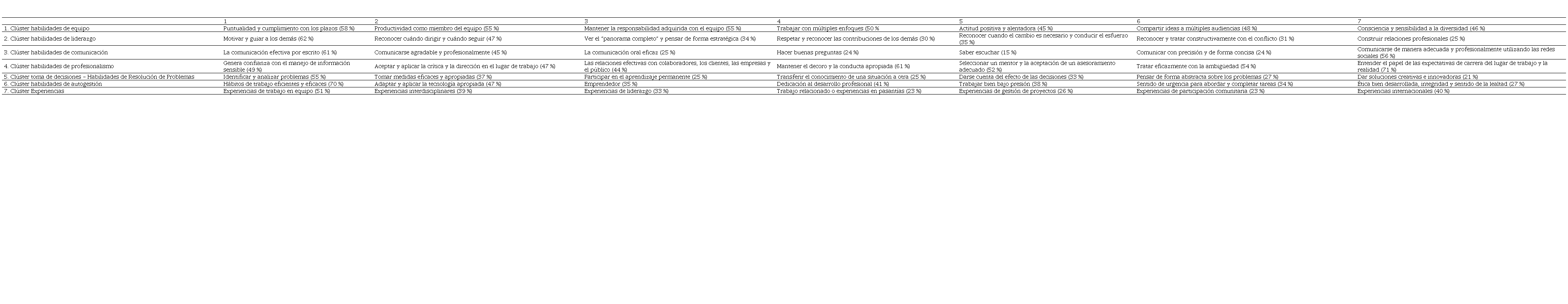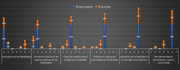 Se solicitó a los encuestados que clasificaran los 7 clúster, dándole una jerarquía de importancia a las habilidades y a los núcleos internos, teniendo en cuenta que son preguntas de clasificación forzada con solo una clasificación permitida por fila y columna.