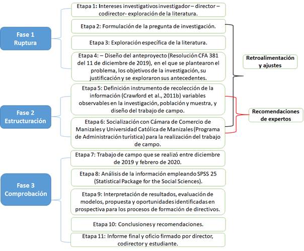 De acuerdo con los planteamientos de Hurtado de Barrera (2010), “toda investigación pretende llegar a conclusiones con significado (…) esta tarea requiere organización, disciplina y planificación previa, por su complejidad y la cantidad de procedimientos a implementar” (p. 101). Con base en este escenario, a continuación, se presenta la Figura 1 con la sistematización del proceso realizado en el marco de esta investigación, con el objetivo de permitir un mayor entendimiento y claridad al lector.