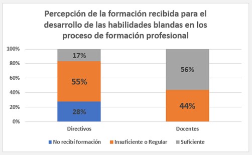 El 28 % de los directivos plantean no haber recibido formación en habilidades blandas. Por otro lado, el 55 % de los directivos, con formación profesional, expresan que fue insuficiente o regular. En el caso de los docentes, el 44 % menciona que su formación para el desarrollo de habilidades blandas fue regular. Lo anterior, es armónico con los resultados de Crawford et al. (2011a), los cuales afirman que tanto empresarios como docentes no se sienten suficientemente preparados en la temática (ver Figura 2).