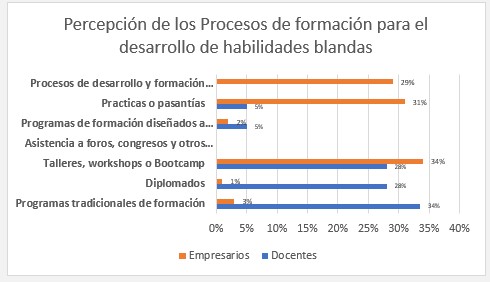 Sobre el particular, Katz (1974) advierte sobre dos errores comunes: por un lado, enseñar habilidades blandas, sin apropiarlas en cada estudiante; y segundo, desarrollar habilidades blandas sin capacidades técnicas, conceptuales y de diseño. Como se aprecia en la Figura 3, es de resaltar que los directivos encuestados identifican los talleres (34 %) y las prácticas o pasantías empresariales (31 %) como las principales fuentes para acceder a dichas habilidades, lo que contrasta con la opinión de los docentes que ubican a los programas de formación profesional tradicionales (34 %) como las más importantes.