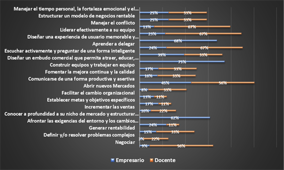 En un resumen de las percepciones de las unidades de análisis sobre los problemas que enfrentan los directivos, se observa que las tres primeras preocupaciones están relacionadas con el desempeño empresarial: diseñar un embudo comercial que permita atraer, educar, convertir y fidelizar clientes de forma recurrente (75 %); diseñar una experiencia de usuario memorable y diferenciadora (68 %); y conocer a profundidad a su nicho de mercado y estructurar una oferta única e irresistible (62 %). Los siguientes tres puestos están ocupados por habilidades de comunicación y autogestión, como comunicarse de una forma proactiva y asertiva (45 %), escuchar activamente y preguntar de una forma inteligente (39 %), y manejar el tiempo personal, la fortaleza emocional y el estrés (25 %) (Ver Figura 4).