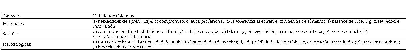Los estudios de inteligencia emocional también apoyan la hipótesis de que las habilidades interpersonales tienen mayor probabilidad para predecir una carrera exitosa (Claxton et al. 2016; Goleman & Boyatzis, 2008), y son necesarias para mejorar el trabajo en equipo (Tang et al. 2018), afrontar el rápido ritmo de la globalización, dialogar en un ambiente multicultural y afrontar la creciente necesidad de retener el talento humano en las organizaciones. Haselberger et al. (2012) identifican un listado de 22 habilidades blandas que se dividen en 3 categorías: personales, sociales y metodológicas, las cuales son relacionadas a continuación en la Tabla 1: