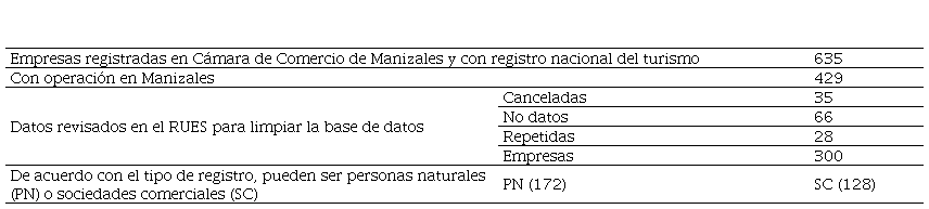 Desde la perspectiva muestral se tuvieron en cuenta a los directivos de las empresas del sector turístico de Manizales registradas en CCM, y que cuentan con el Registro Nacional de Turismo (RNT), como criterios base de elegibilidad. A continuación, en la Tabla 3, se realiza una síntesis del proceso de depuración que se efectuó con la CCM a la base de datos para acceder a las empresas que están en operación.