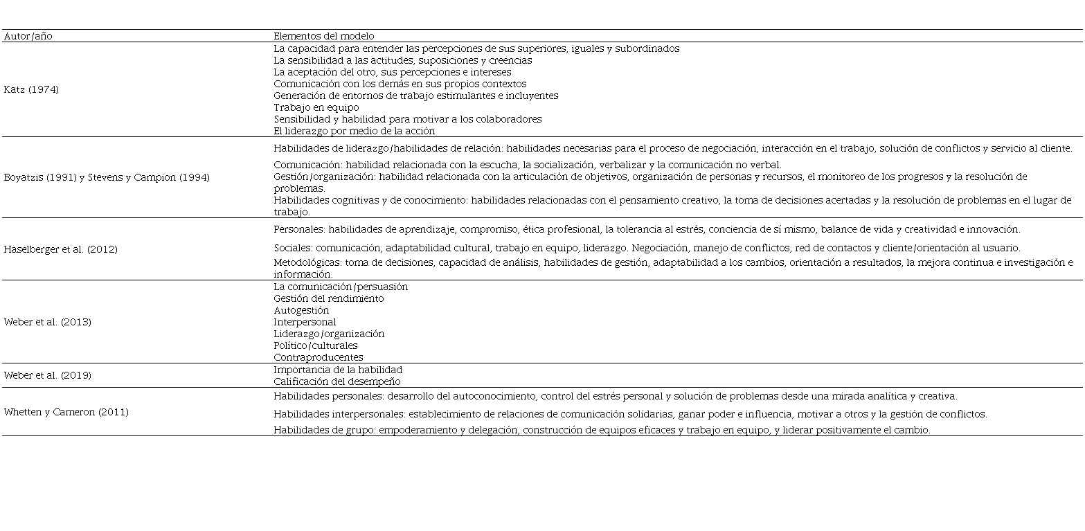 Se entiende que, desde los diferentes modelos, se están identificando las competencias que definen a los gestores eficaces y lo que realmente hacen (Whetten & Cameron, 2011) para desarrollar la capacidad del ejecutivo de trabajar eficazmente, como miembro del grupo, y construir cooperación dentro del equipo que dirige (Katz, 1974). Es preciso tener en cuenta que las habilidades sociales, interpersonales o humanas son complementarias de las habilidades y conocimientos técnicos en el lugar de trabajo (Kantrowitz, 2005; Rainsbury et al., 2002) y en otras áreas o escenarios de la vida de la persona, entendiendo que estas habilidades son desarrolladas en el día a día y hacen parte de la cotidianidad del directivo en su ejercicio profesional y personal, instalándose de forma inconsciente y natural en su actuar e interacción profesional y personal (Katz, 1974).