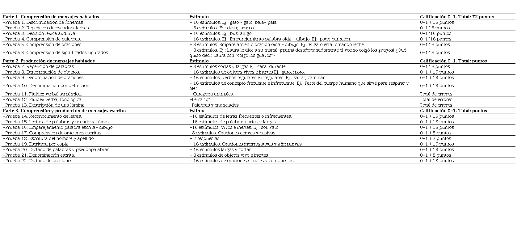 Sus pruebas están distribuidas de manera tal que exploran la ruta de comprensión y producción del lenguaje en la modalidad oral y escrita. Estas propuestas de evaluación contemplan rutas de entrada y salida, planteadas en la modularidad de un sistema (Cuetos Vega et al., 2015), que permiten identificar no solo los componentes alterados, sino también aquellos que estando conservados permiten reelaborar la recuperación de habilidades lingüísticas (Cuetos Vega, 2018; Guevara Agredo et al., 2023).