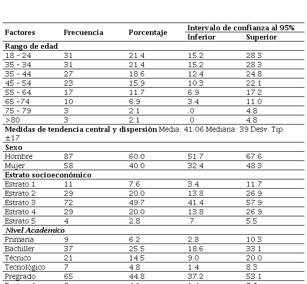 La población participante se ubicó en los rangos de edad 15 a 24 años y de 25 a 34 años, principalmente, con una proporción de 21.4 % respectivamente; la dispersión fue de DS± 17 respecto a la media. Estos resultados están relacionados con el comportamiento general de la población del municipio de Popayán; la pirámide poblacional muestra como las edades más frecuentes están entre los 15 y los 24 años (DANE, 2019a). Los datos de la población también concuerdan con la información de la población por edad en esta región; de acuerdo con el Fondo de Población de las Naciones Unidas (2018), el 68 % de la población se encuentra entre los 15 y 64 años.