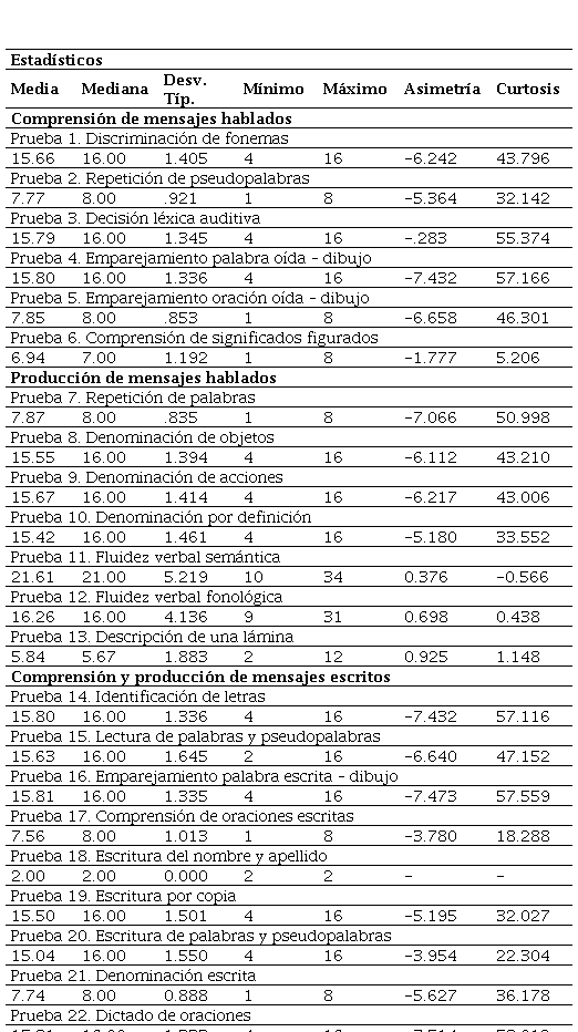 En el segundo componente producción de mensajes hablados, compuesto por 7 pruebas, los resultados fueron diferentes: se presentó una variación en las respuestas sobre 3 pruebas (fluidez verbal semántica, fonológica y descripción de una lámina), que presentaron una puntuación más dispersa en sus respuestas (DS ± 5,2, 4,1 y 1,8, respectivamente) y una diferencia entre los valores mínimos y máximos, con un IQR de 24, 22 y 10, lo que reitera la variabilidad. Los valores de asimetría se relacionan con estos hallazgos, pues es positiva, y la curtosis describe que los datos en estas 3 pruebas son mesocúrticos; así mismo, la prueba de K-S (p>0.000) indicó una distribución no paramétrica, y el Alfa de Cronbach fue de α = 0.51, que corresponde a una fiabilidad cuestionable. Sin embargo, en las 4 tareas restantes (repetición de palabras, denominación de objetos, denominación de acciones y denominación por definición) la prueba de fiabilidad fue de α = 0.988, lo que representa un valor excelente (George & Mallery, 2018; Guevara Agredo et al., 2023).