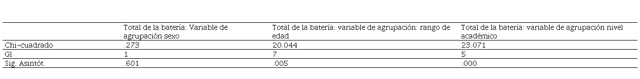 Por su parte, los datos en la Tabla 5 muestran los resultados de la Prueba de Kruskal-Wallis aplicada para explorar cómo la edad, el nivel académico y el sexo influían sobre los resultados del PEPLA. Se encontró que las variables compuestas por edad y nivel académico influyeron de forma importante sobre las puntuaciones obtenidas; es decir, se presentaron variaciones en los resultados de la evaluación del lenguaje oral, según la edad y según el nivel educativo. El estadístico de contraste fue de p < 0.05 y p < 0.00, respectivamente. En este estudio, el sexo no tuvo influencia en la puntuación y no se encontró ninguna variación significativa.