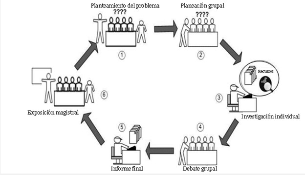 A continuación, se describen cada una de las etapas de la metodología, a saber: Planteamiento del problema, Planeación grupal, Investigación individual, Debate grupal, Informe final, y Exposición final (Figura 1).